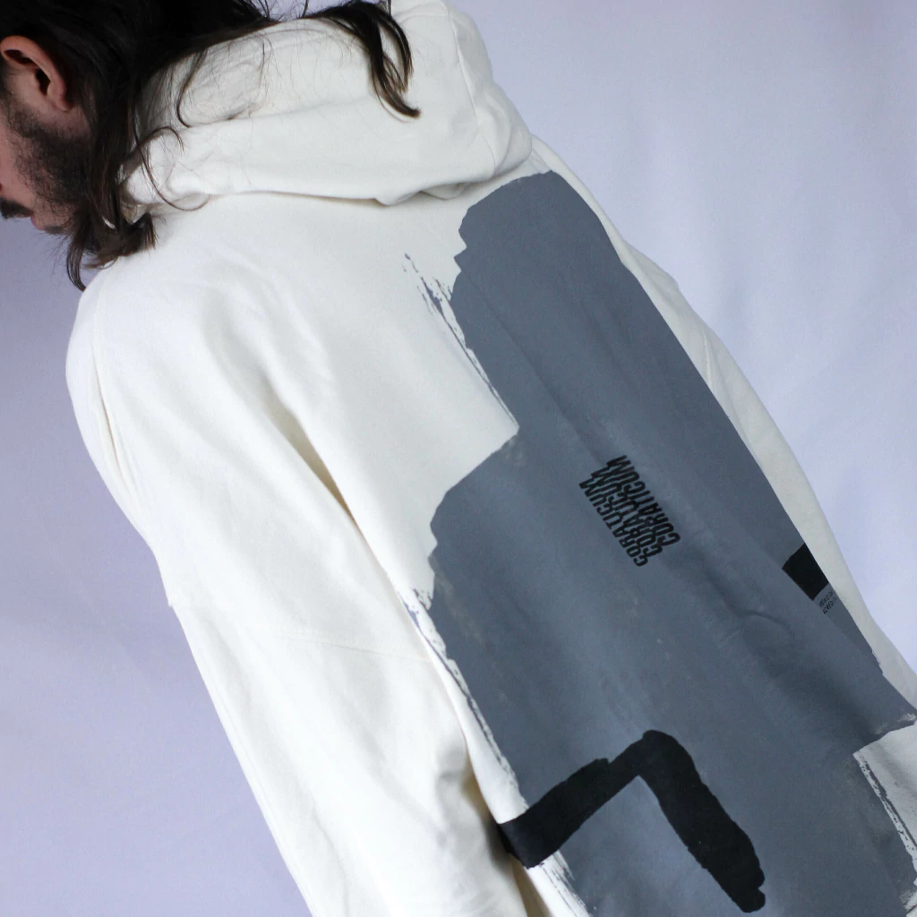 feito com tecido de moletom felpado 100% algodão sustentável, possui caimento amplo oversized, capuz entrelaçado sem cordão, bolso canguru, punhos e barra em ribana. estampa autoral, produção manual com tinta à base de água não tóxica.
